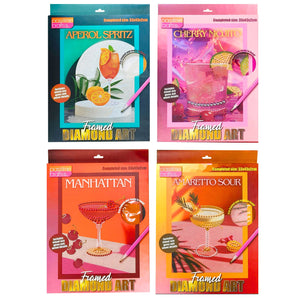 Shake up your space with this stylish and sparkling Framed Diamond Art Collection inspired by your favourite cocktails! Featuring bold, aesthetic designs that compliment any room - Amaretto Sour, Aperol Spritz, Cherry Mojito, and Manhattan - these kits combine creativity and décor in one satisfying project.